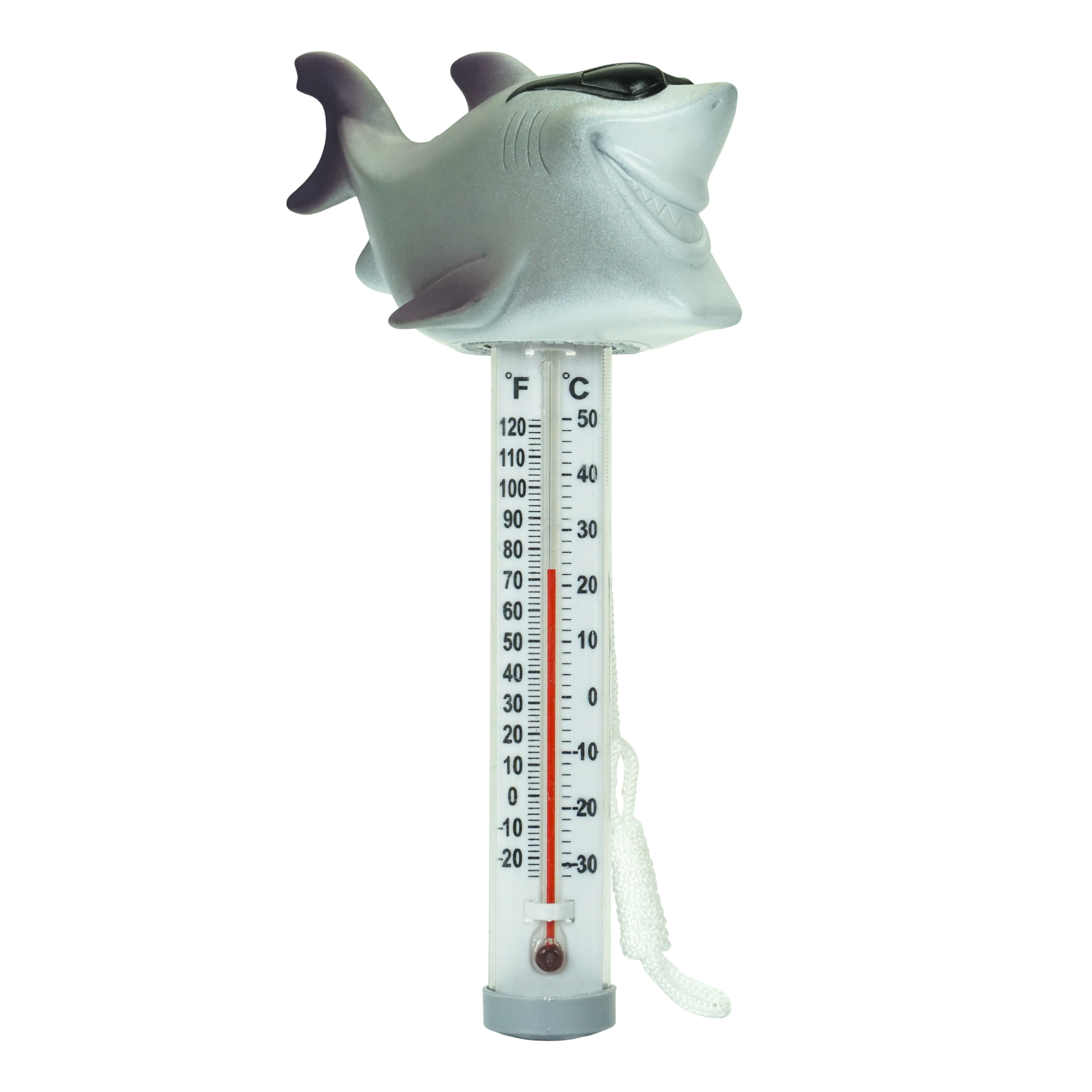 Floating shark thermometer for use in above ground and in-ground pools. This thermometer has a cool looking shark head with sunglasses attached to top for thermometer. Temperature display has a easy to read design. For your convenience this thermometer can be attached with a string to you pools steps or ladder.