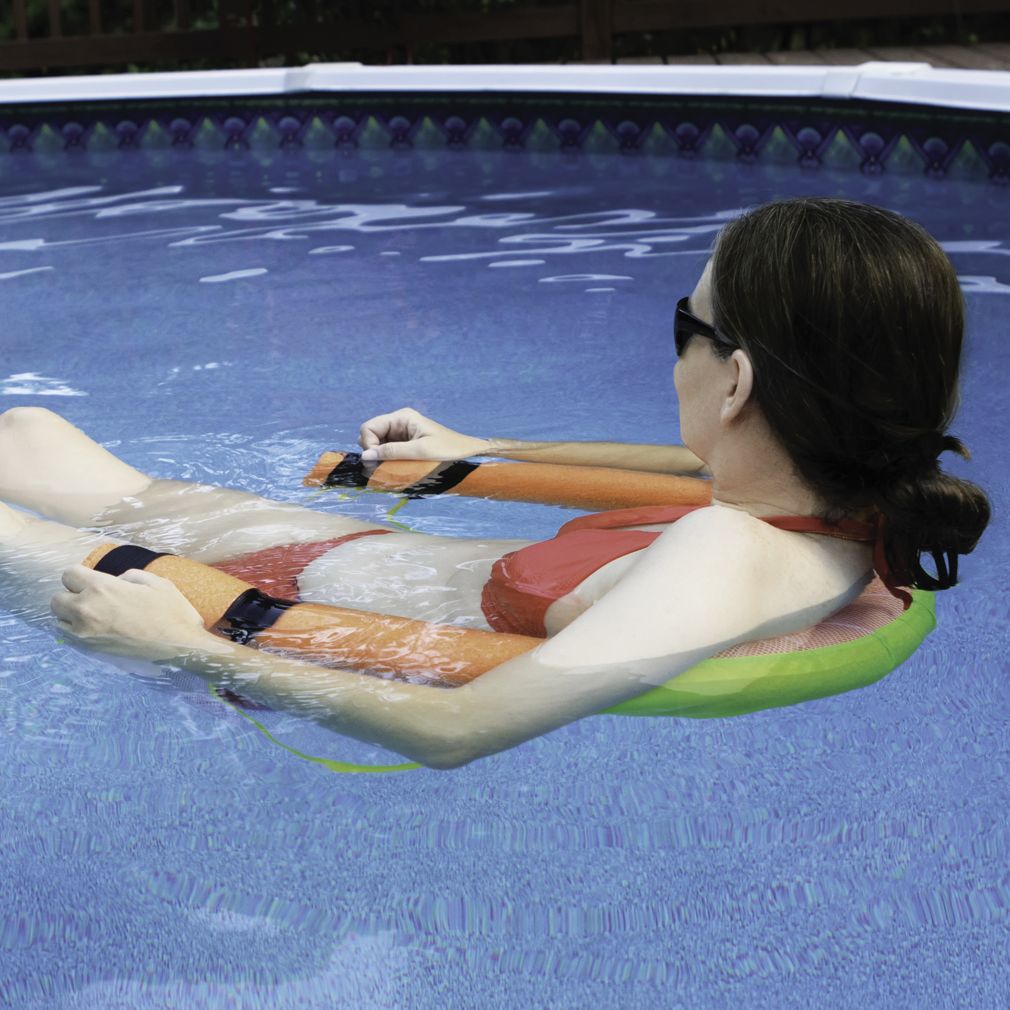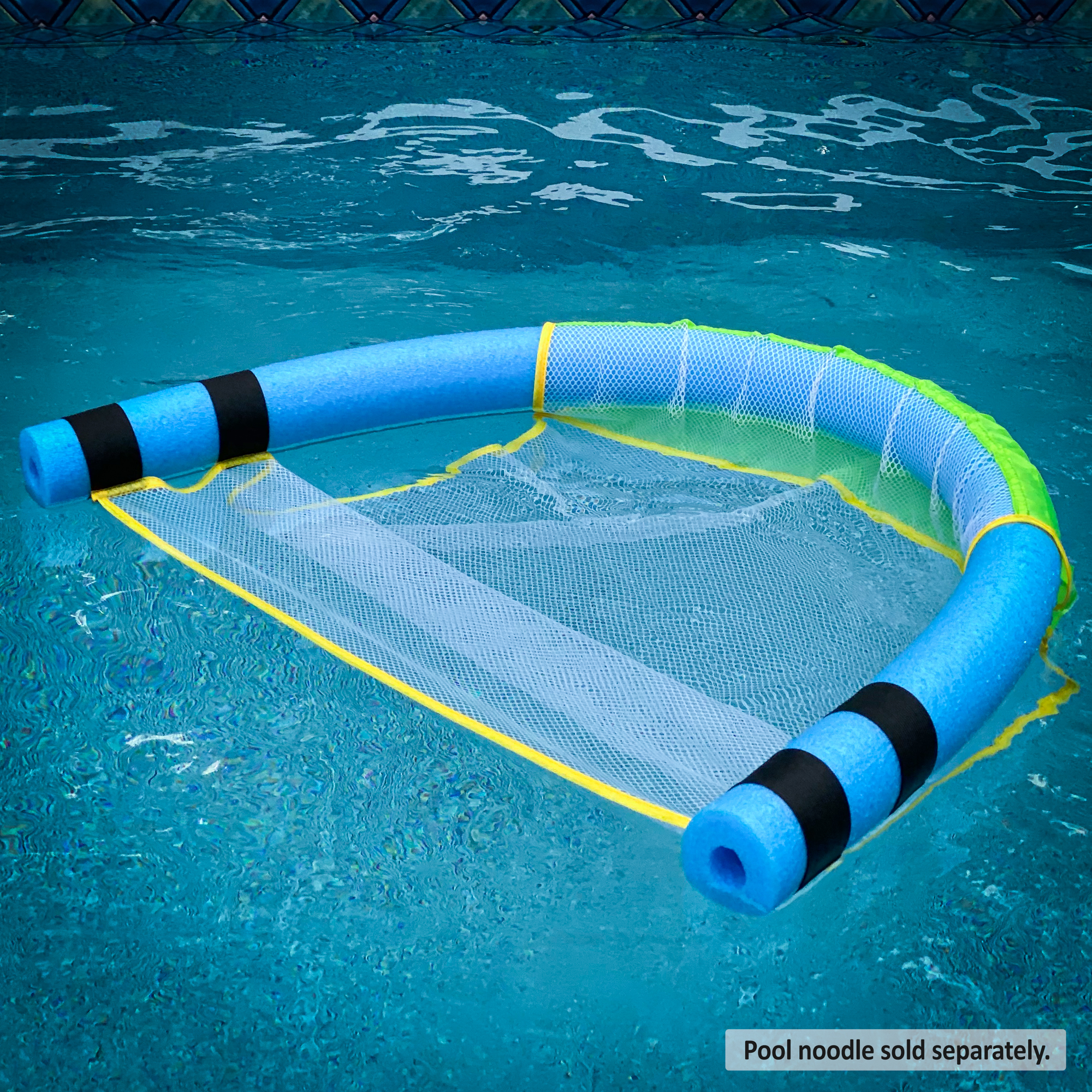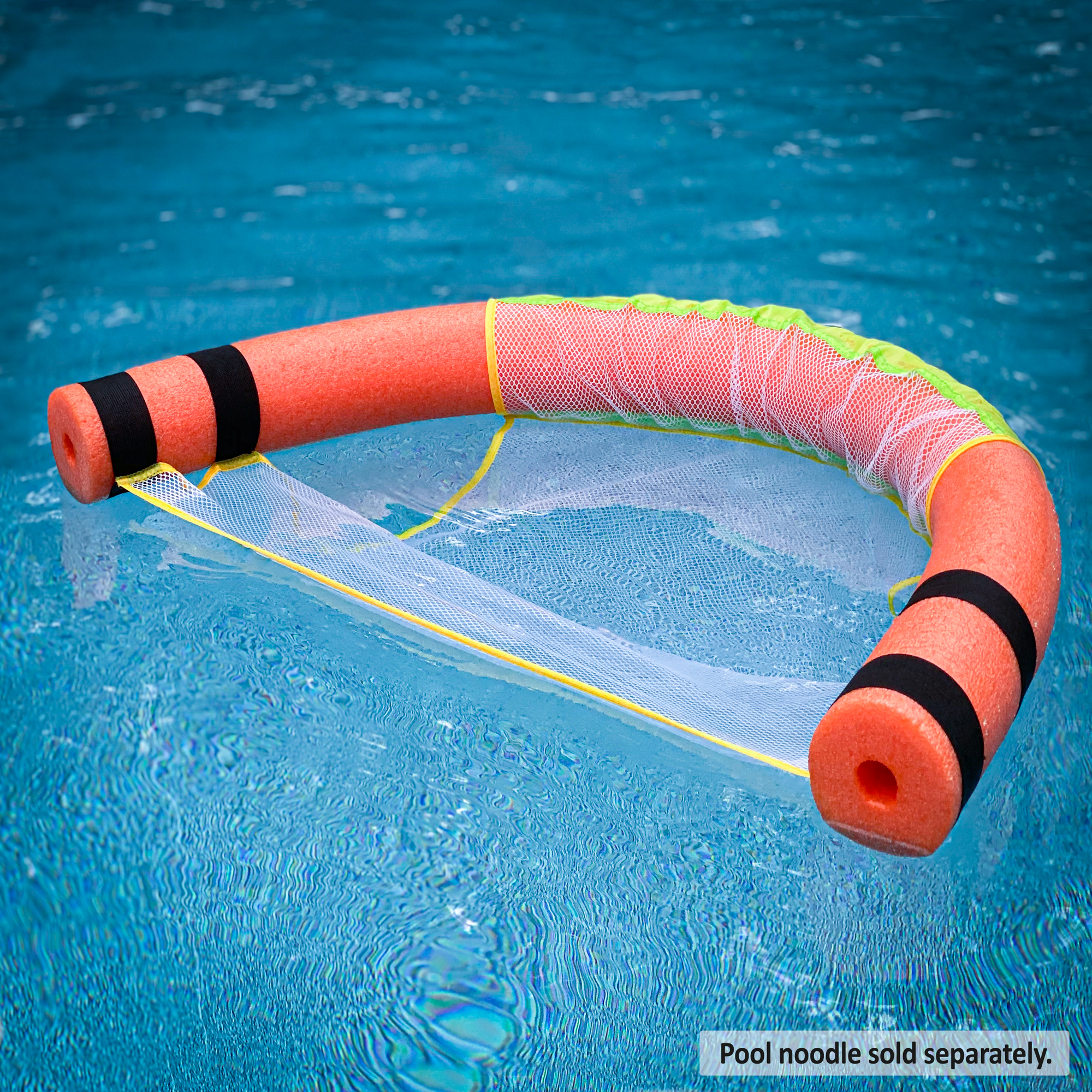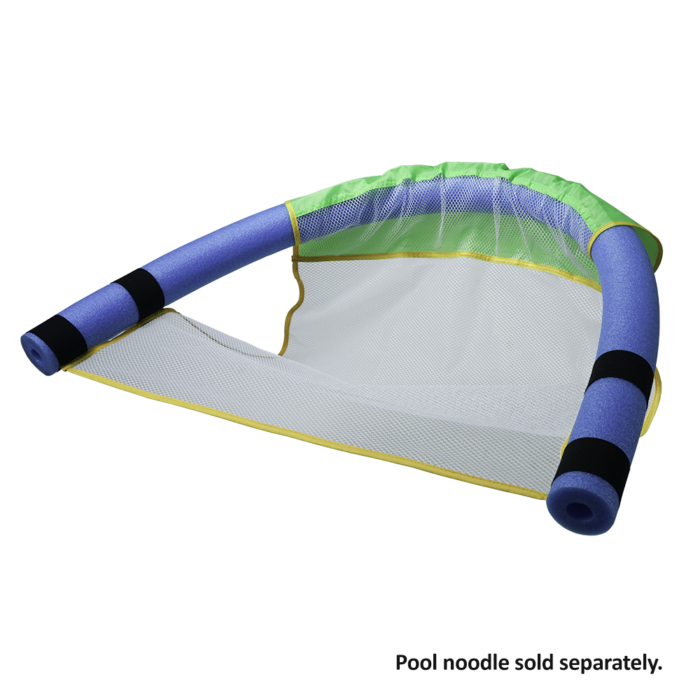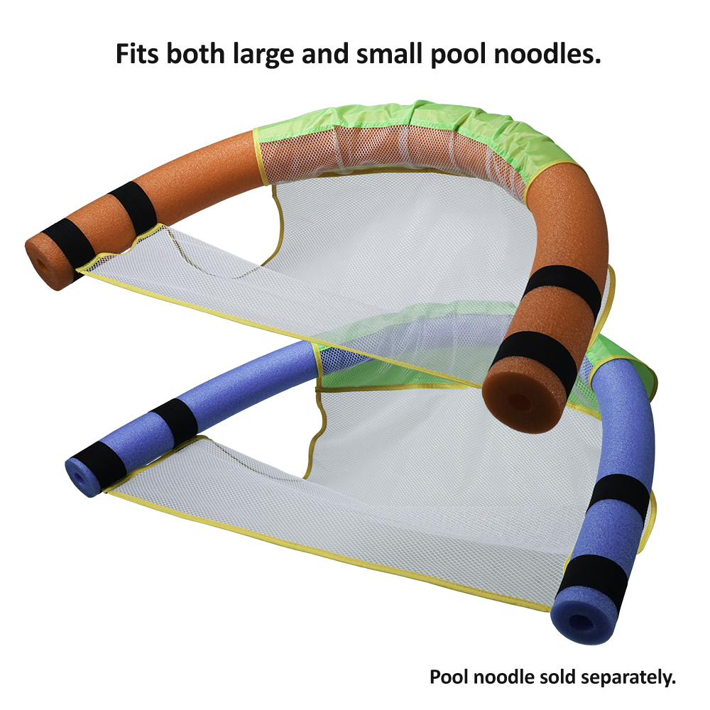 Mesh chair designed to work with pool noodles. Small and portable. Just insert your pool noodle and take a seat. Pool noodle sold separately.